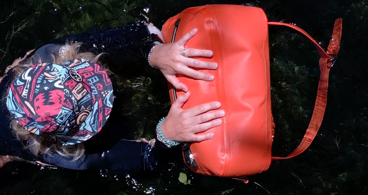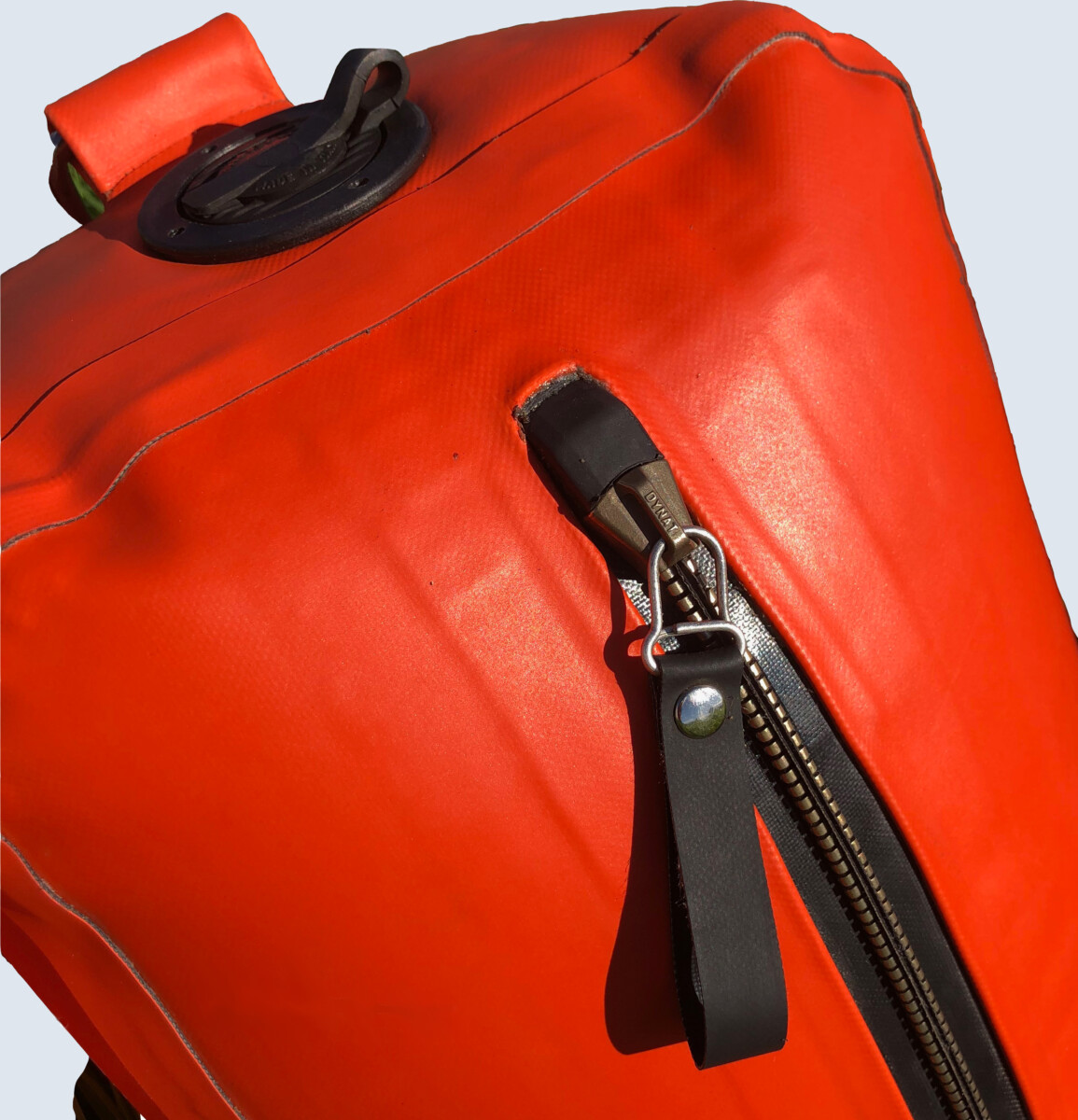 - Prima di ogni utilizzo verificare sempre l’integrità e la funzionalità dello zaino stagno. Chiudere la zip lasciando all’interno dello zaino più aria possibile, lasciare il tappo aperto della valvola e verificare che il bulbo della valvola sia chiuso, perno centrale posto in posizione alta. Premere con forza sulla superficie dello zaino e verificare che non si sgonfi. Utilizzando acqua saponata e/o liquidi rileva fughe verificare che non ci siano perdite di aria.