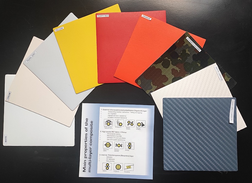 - Tessuto hypair ® ad alta resistenza gommato su entrambi i lati con neoprene (CR) – hypalon (CSM)